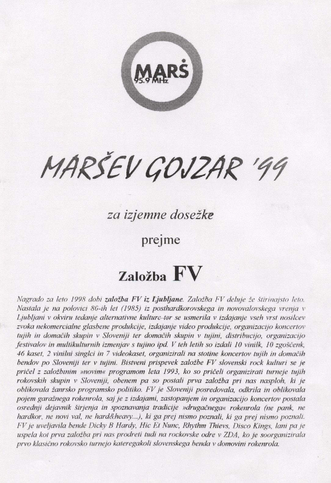 FV je leta 1999 prejel nagrado Radia Marš za posebne dosežke na področju glasbe (ameriška turneja), nagrajena pa je bila tudi izdaja I Whistle You Dance skupine Dicky B. Hardy.