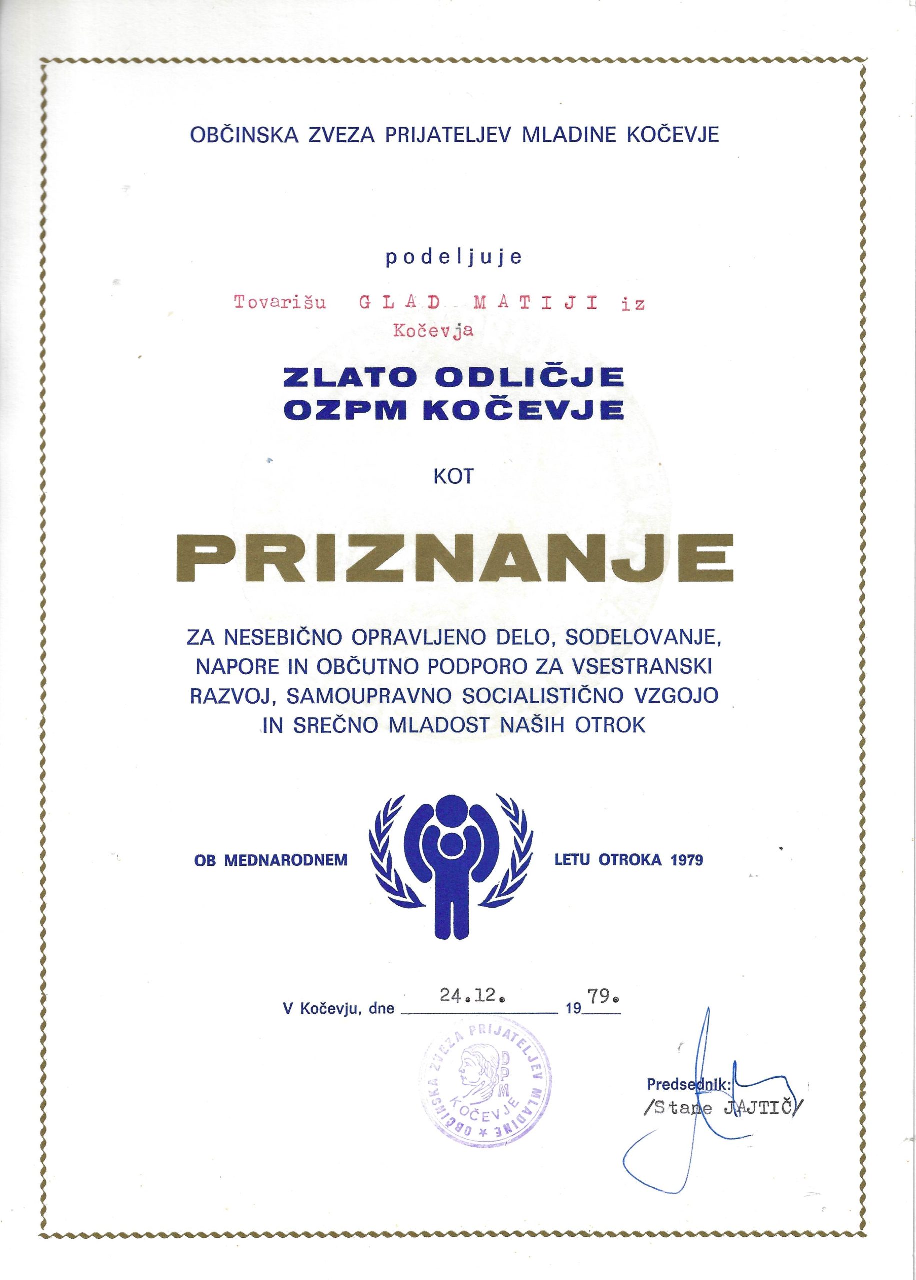 Zlata značka za požrtvovalno in vztrajno delo v dobro mladega rodu, 1979