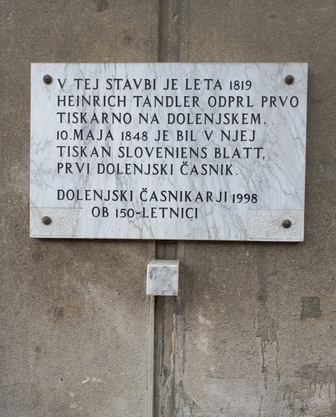 Henrik Tandler - Spominska plošča na stavbi na novomeškem Glavnem trgu, kjer je bila nekoč Tandlerjeva tiskarna.