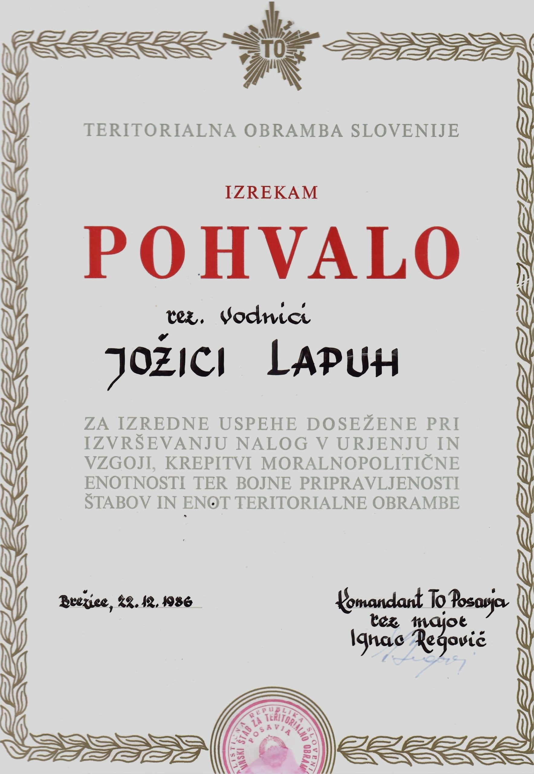 pohvala Teritorialne obrambe Slovenije, 1986